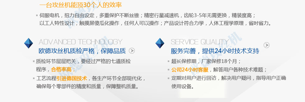 質(zhì)量求生存的方針,我們真誠歡迎新老客戶選用我公司產(chǎn)品。公司注冊資金1000萬元。公司以可靠的電動攻絲機質(zhì)量和合理的價位打動眾多消費者。公司創(chuàng)造了一流的售后服務(wù)。我公司一如既往地堅持數(shù)控攻絲機服務(wù)第一的宗旨。我公司以只有最好的精神指導(dǎo)各項工作大力塑造品牌。我公司新廠區(qū)擁有齊全的現(xiàn)代化生產(chǎn)設(shè)備。充分利用區(qū)域和行業(yè)優(yōu)勢。精誠服務(wù)贏信譽是我們的鋼筋上絲機質(zhì)量方針。進取精神是企業(yè)能與時俱進的動力和發(fā)展的源泉。